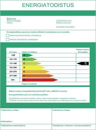 Energiatodistus on useiden sivujen mittainen energiaselvitys, joka soveltuu parhaiten omakotitaloihin, paritaloihin ja pienempiiin rivitaloihin. Energiatodistus on pakollinen olemassa oleville rakennuksille myynnin tai vuokrauksen yhteydessä (ei pientalot eikä alle 6 asunnon asuinrakennukset tai asuinrakennusryhmät) sekä kaikille rakennuksille, joille haetaan rakennuslupaa. Energiatodistus on suositeltava ennen 1.1.2008 valmistuneille pientaloille ja enintään kuuden asunnon asuinrakennuksille tai asuinrakennusryhmille. Energiatodistus sisältää kiinteistökatselmuksen ja 10 vuotta voimassa olevan energiatodistuksen. Mikä energiatodistus on?Energiatodistuksen avulla kiinteistön omistaja/ostaja voi vertailla rakennusten energiatehokkuutta. Energiatodistuksessa ilmoitetaan energiamäärä, joka tarvitaan rakennuksen tarkoitusta vastaavaan käyttöön. Energiatodistuksella voidaan vertailla rakennusten välistä energiatehokkuutta. Energiatehokkuuden perusteella kiinteistölle määritellään energialuokka asteikolla A-G. Vähiten energiaa kuluttaa A-luokan kiinteistö, eniten G-luokan kiinteistö. Kiinteistön lämmitysmuodolla ei ole vaikutusta rakennuksen energialuokkaan. Energiatehokkuuden parantaminen on kiinteistön omistajan etu, koska mitä vähemmän energiaa kiinteistö kuluttaa, sitä enemmän omistaja säästää selvää rahaa. |